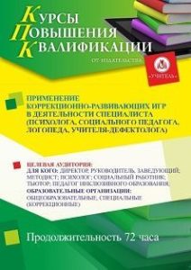 Применение коррекционно-развивающих игр в деятельности специалиста (психолога, социального педагога, логопеда, учителя-дефектолога) (72 ч.)